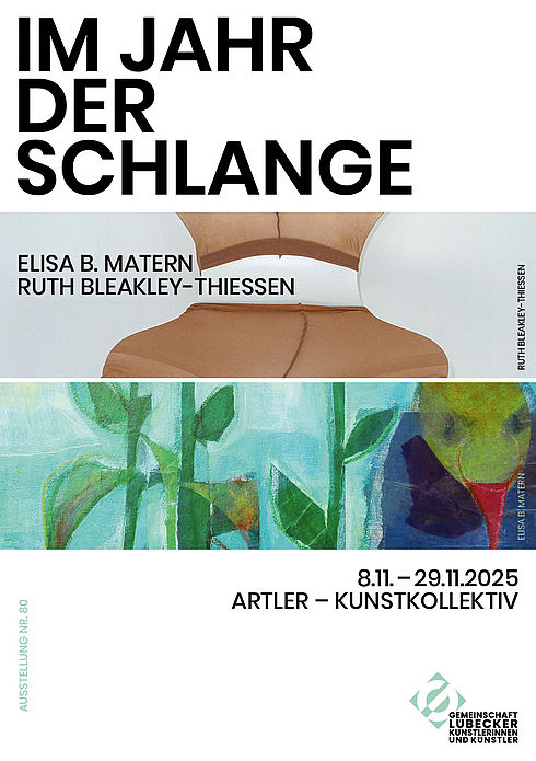 Die Gemeinschaft Lübecker Künstlerinnen und Künstler präsentiert im Artler Kunstkollektiv eine neue Ausstellung mit dem Titel IM JAHR DER SCHLANGE von Elisa B Matern (Elisabee) und Ruth Bleakley-Thiessen.